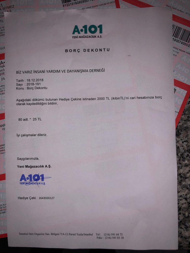 Hediye Çekleri Dağıtımı 19 Aralık 2018 EditörA101 marketlerinde geçerli toplam 2000 TL değerinde hediye çekleri yardıma muhtaç ailelere dağıtılmıştır.